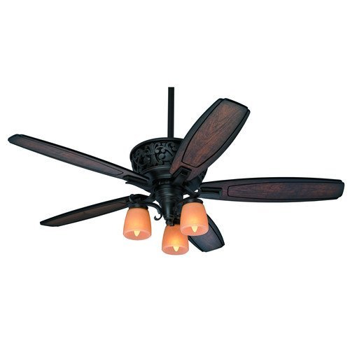 The highly decorative Hunter Prestige Willowcrest 54 in. Indoor Ceiling Fan features a cut-out floral design on its housing and five bronze/brown blades. Its three premium glass shades house ENERGY STAR-certified lights.   About Hunter Fan Hunter Fan traces its origins back to 1886 when John Hunter and his son, James Hunter, made the first water-driven celling fan in upstate New York. Today the company blends 19th century craftsmanship with innovative designs and technology to make fans of unmatched quality, style, and performance. Hunter Fans now has offices in three countries and retail outlets around the world. Hunter Fans offers style, comfort, and health for you and your family. Their fans are handcrafted from the finest materials to last a lifetime. Hunter ceiling fans function perfectly and always deliver proven performance. They also offers air purifiers and humidifiers to make a truly healthy environment for your family. Hunter fans are as beautiful as they are whisper-quiet and efficient. ENERGY STAR certified lights. Brittany bronze housing finish. 5 bronze/brown blades. 54-in. blade span, 13-degree blade pitch. Pull-chain operation. 3-speed WhisperWind motor. 2 or 3 in. from canopy to motor. Included light kit requires three 60-watt incandescent bulbs (included).