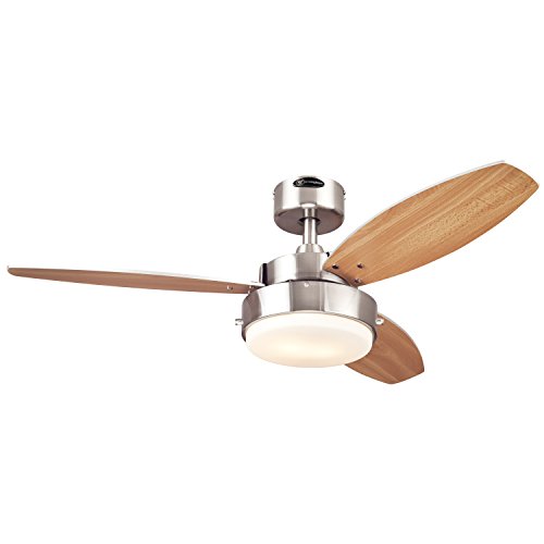 Add modern refinement to your home with the Westinghouse Alloy Two-Light 42-Inch Reversible Three-Blade Ceiling Fan. The brushed nickel finish and opal frosted glass fixture have a sleek, modern look, while the beech/wengue reversible blades make it easy to match your decor.